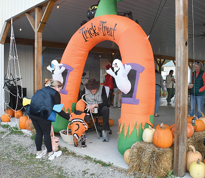 Jack Larson greeted trick-or-treater Brooks Lewis at the entrance to The Barn at Old Farm Truck Market during Candy for Kids in White Stone. Old Farm Truck won first place in the decorating contest. Inner Beauty Hair Salon placed second and the Woman’s Club of White Stone, third. Photo by Lisa Hinton-Valdrighi