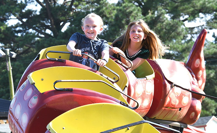 From left, Lydia Hudson and Delilah Wood test the kids coaster in preparation for the opening of the 90th Kilmarnock Volunteer Fire Department Firemen’s Festival tonight, July 31. Photo by Lisa Hinton-Valdrighi