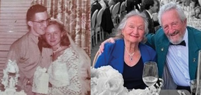 From left are newlyweds Charlie and Anne Costello on August 7, 1955, and celebrating their 68th wedding anniversary while attending a grandson’s wedding reception in 2023.