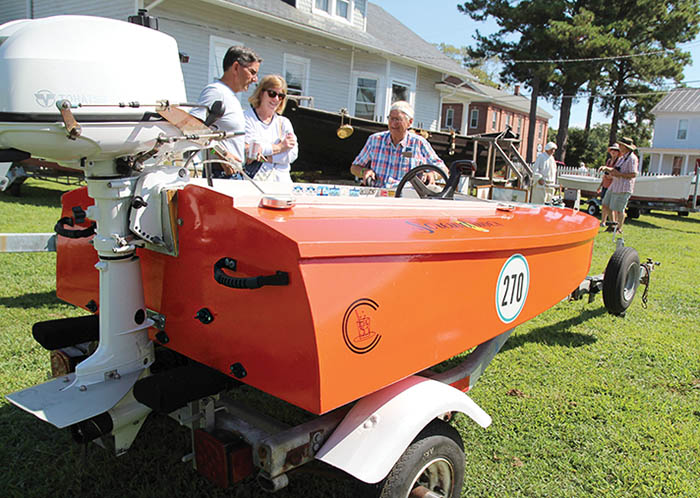 Screwdriver, this 1939 Chesapeake Light Craft Design owned by Art Gilbert, is part of the Cocktail Class Wooden Boat Racing Association. Visitors got to see it Saturday, September 13, during the annual Classic Boat Show. Some 43 classic boats were displayed at the Reedville Fishermen’s Museum, the Reedville Marine Railway and Reedville Market docks, while boat-related vendors and organizations set up in the museum parking lot. Sponsors included Omega Protein, Ocean Harvesters, Jett’s Marine, Lilian Lumber, Ross’s Fine Jewelers, Ingram Bay Homes, Jeff’s Country Market, Primis Bank, United Bank, Al Pugh Distributing Company, Chitterchats Ice Cream Parlor and Engineering Design Associates. Photo by Jackie Nunnery