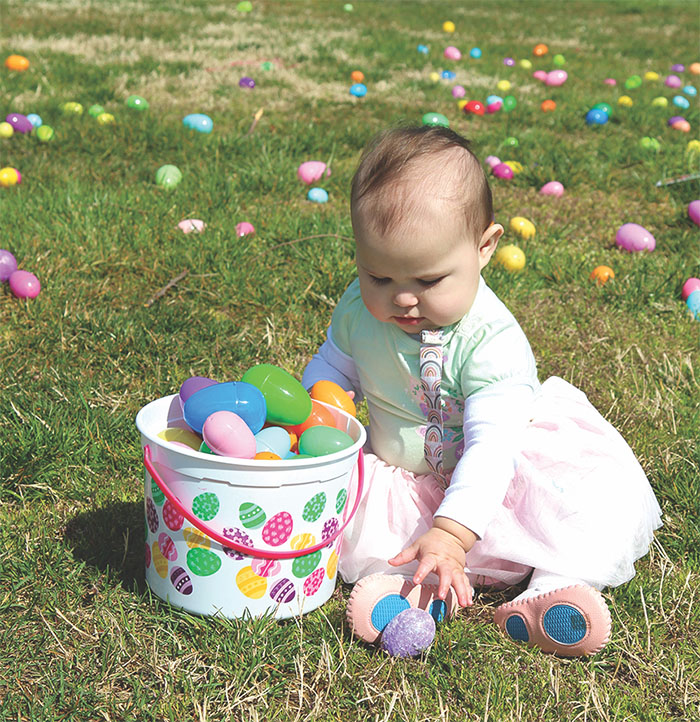 March 31 was a picture-perfect Easter Sunday for families to gather at Town Centre Park in Kilmarnock for worship and a classic Easter egg hunt sponsored by White Stone Church of the Nazarene and Calvary Baptist Church. According to Cathy Smith, children’s pastor for the Church of the Nazarene, members of both churches filled 9,000 eggs with candy and put together gifts for children of every age. Above, Sonora Castro, 11 months, was successful in her first Easter egg hunt. Photos by Jackie Nunnery