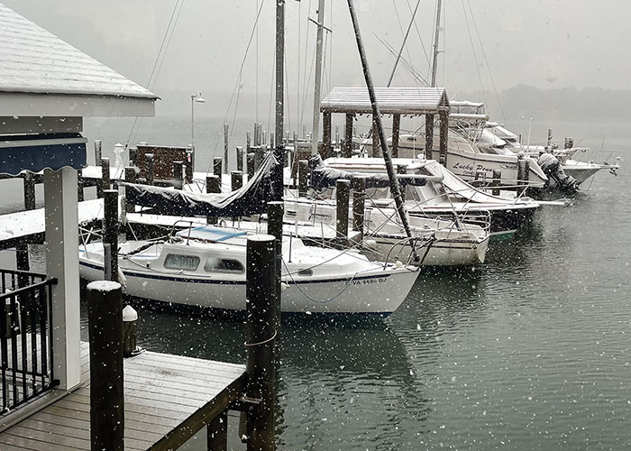From sunny and high-80s on Wednesday, March 11, to rain turning to snow the very next day leaving more than an inch in the lower Northern Neck and disappearing within 24 hours. Snow fell (above) on the Great Wicomico River around 4:30 p.m. Thursday, March 12, where visibility was severely limited from Horn Harbor Restaurant. Torrential rains, high winds and the threat of tornadoes on Monday, March 16, preceded sunshine and seasonal temps on Tuesday, March 17. Welcome the first day of Spring, Friday, March 20. Photo by Robert Mason Jr.
