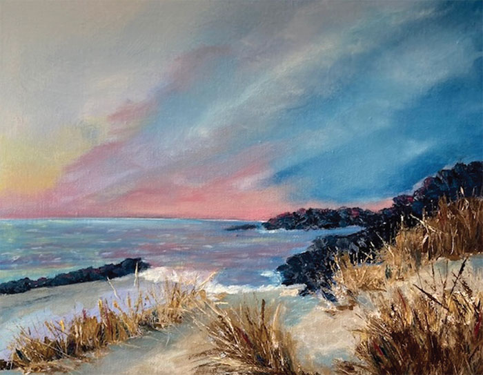 When Bull retired here in 2018 her eyes were opened to a love of painting seascapes, said Huddy. She enjoys spending time kayaking to find the hidden beaches here and the simple beauty of life found at the edge of the Chesapeake. Bull discovers images that inspire her to paint scenes that she sees from her point of view; the intimate visions of nature that require the viewer to focus on the details of areas that are left untouched by humans…