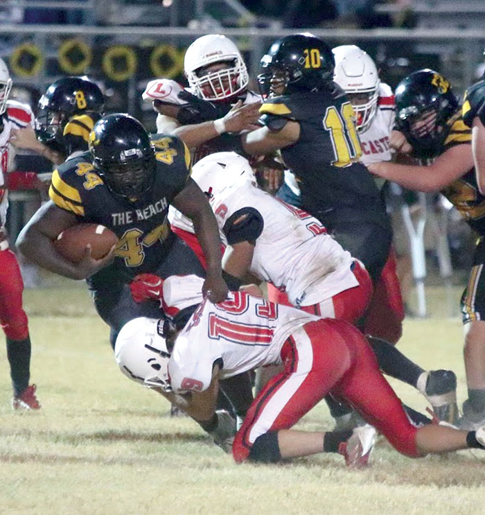The Lancaster High School varsity football season came to an end on Thursday, November 7, when Colonial Beach stumped the Red Devils, 28-22. Noah Benson (19) makes the tackle in the season finale. LHS finished at 2-8 on the season and 0-5 against Northern Neck District teams for a ninth-place finish in the region. The top eight teams make post-season play, which begins tomorrow, November 15. Rappahannock, Essex, Westmoreland and Northumberland are all playing in the Class 1 first round. The Eagles will host the Indians, the Raiders will host King & Queen and the Trojans will host West Point. Middlesex will travel to Northampton. Kickoff is 7 p.m. Photo by Jennifer Benson