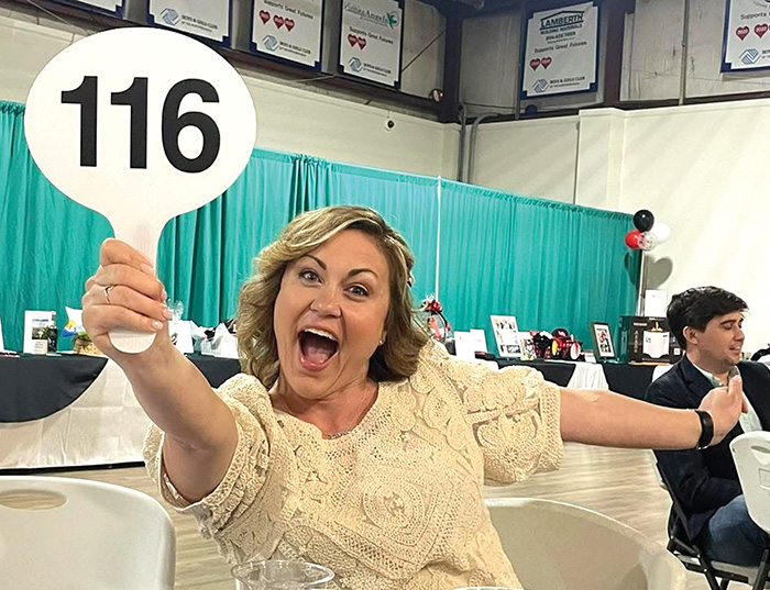 Tiffany Harding shows her excitement after winning a Terry McLaurin autographed Washington Commanders helmet at the Lancaster High School Boosters Club third annual Red Devils Auction and Dinner Saturday, March 21, at the Boys & Girls Club of the Northern Neck in Kilmarnock. The event raised $40,000 for the athletic department. Photo courtesy of Tiffany Harding