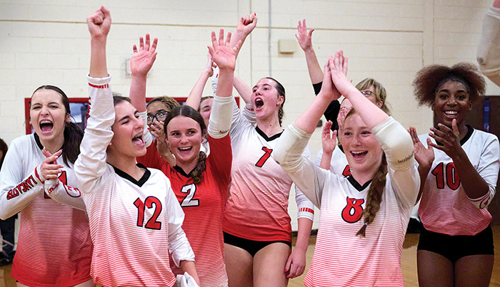 Lancaster varsity volleyball players celebrated a Region 1A quarterfinal win over Rappahannock on Monday, November 3. The Lady Devils swept the Raiders, 3-0, and will host a semifinal match against Mathews at 6 p.m. tonight, November 6. The Blue Devils beat Northampton, 3-2, to advance. Middlesex, who blanked Charles City, 3-0, will host Northumberland, a 3-2 winner over West Point, in the other semifinal. A win for LHS tonight automatically earns the Lady Red Devils a berth in the Class 1 state tournament. Look for more Region 1A tournament coverage in the November 13 Rappahannock Record. Photo by Bill Kramer