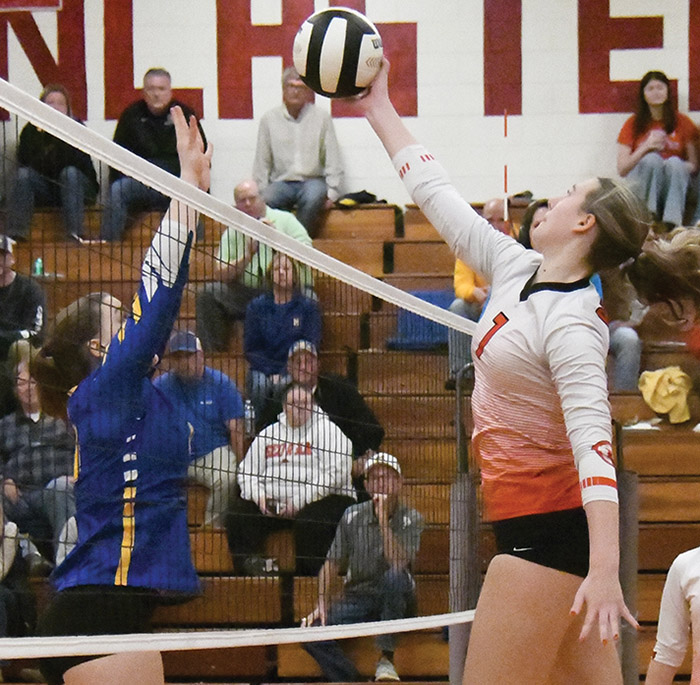 Lexi VerMeer of Lancaster puts over one of her 20 kills in a regional semifinal match November 6 against Mathews. The Lady Devils lost to Middlesex Tuesday but still move on to the state playoffs. Photo by Lisa Hinton-Valdrighi