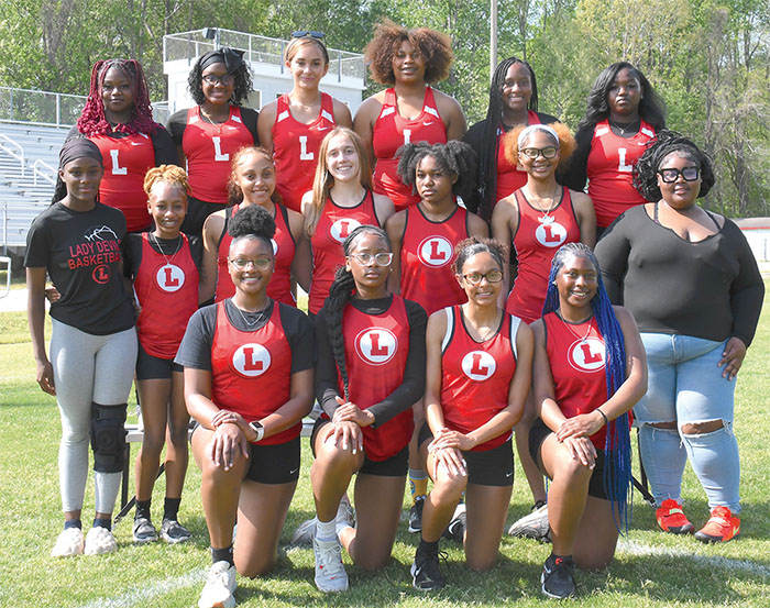 Lancaster High School girls track team members from left are (front row) Tahlia Sutton, Anya Taylor, Courtney Johnson and Madison Blackwell; (next row) manager Alexis Smith, Liberty Pinn, Alexis Kelley, Rory Lally, Ni’Asha Williams, Mackenzee Dagner and Brianna Fisher; (next row) Dior Pinn, Cailyn Seymour, Angelina Smith, Elisa Veal, Karmyn Davis and Zy’Yare Ball. Other team members are Ayla Saunders, Precious Gibson, Chassity Henderson, Knowell Garrett, Marley Bean and Brandi Wade. Photo by Lisa Hinton-Valdrighi