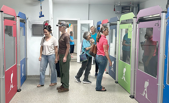 Guests tour the new 4,500-square-foot no kill shelter opened by Northern Neck Partners for Pets on Devils Bottom Road in Lancaster. The facility has 24 dog kennels and can house up to 30 cats. It includes separate intake, birthing and isolation rooms and kitchen, along with a large cat room with outdoor porch. Each dog kennel also opens to outdoor runs. The shelter is on a 36-acre track and was privately funded. Several hundred people toured the facility during its grand opening on Saturday, May 17. Photo by Lisa Hinton-Valdrighi