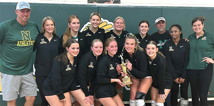 Northumberland beat Rappahannock, 3-1, to claim the Northern Neck District tournament volleyball championship on Thursday, October 30. From left are (front row) Abigail Bates, Audrey Dawson, Tawny Bowis, Lacie Self and Lily Hayden; (next row) assistant coach Chip Williams, Presley Gracik, Ally Biddlecomb, Meghan Downing, Claire Walker, assistant coach AB Crowther and coach Haley Headley. Photo courtesy of Katie Walker