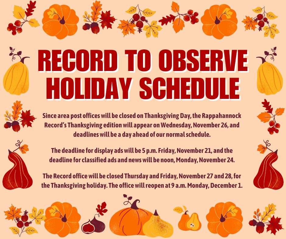 KILMARNOCK—Since area post offices will be closed on Thanksgiving Day, the Rappahannock Record’s Thanksgiving edition will appear on Wednesday, November 26, and deadlines will be altered.