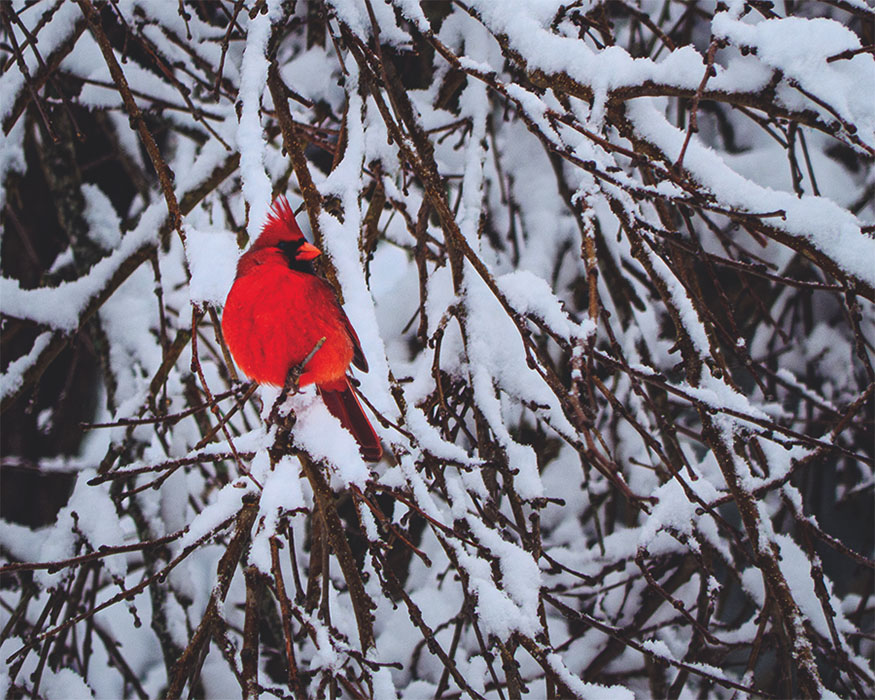 A cardinal is hard to miss in the snow. Photo by Tom Martin, Enso Illuminations