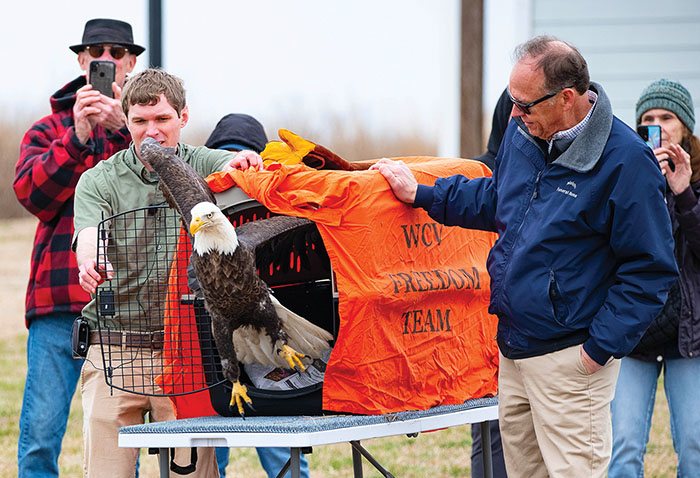 This Bald Eagle was successfully released Thursday, March 13, at Belle Isle State Park. The eagle was rescued from a farm in Northumberland County in January. The Wildlife Center of Virginia treated the eagle for lead poisoning and a fractured bone. Photo by Bob Sutherland