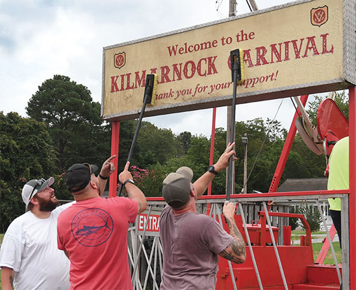 The 89th Kilmarnock Volunteer Fire Department Firemen’s Festival will start tonight, July 25, at the KVFD Carnival Grounds, 200 Waverly Avenue, Kilmarnock. Festival president Cody Smith (left) watches as NNK Softwash LLC gives new sparkle to the Welcome to the Kilmarnock Carnival sign. The festival will continue nightly, except Sunday, through August 3. Photo by Lisa Hinton-Valdrighi