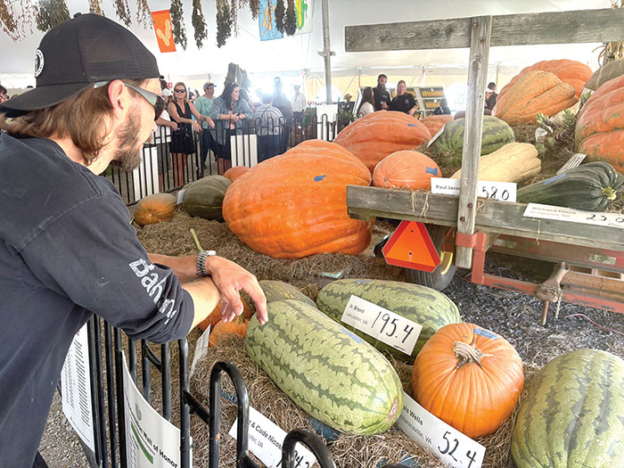 Billy Lackert of White Stone marvels at the 195.4-pound watermelon entered by JR Brent of Lancaster in the 2025 State Fair of Virginia giant vegetable competition. Brent placed second behind Gwen and David Harris of Blacksburg in the giant watermelon category, whose watermelon weighed in at 232.6 pounds. Jett and Cade Nicosia of Lancaster placed third, 194.2 pounds, and Lucius Williams of Hatfield fourth, 166.6 pounds. Photo by AnnGardner Eubank