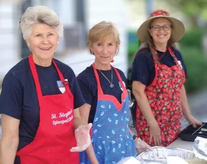 From left, Nancy Gates, Evie Cox and Ruth Green are ready to serve homemade strawberry shortcakes. Photo by Ellen Kirby