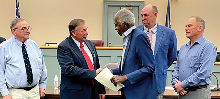 The Northumberland board of supervisors on Thursday, December 11, recognized outgoing District 2 supervisor Richard Haynie for his 24 years on the board, 16 as vice-chairman and five years as chairman. “You don’t serve on this board for personal gain. You do it for your own joy of helping the public and I have really enjoyed serving here on this board,” said Haynie. From left are District 4 supervisor A.C. Fisher Jr., Haynie, District 3 supervisor James Long, District 5 supervisor Chip Williams and District 1 supervisor James Brann. Photo by Jackie Nunnery