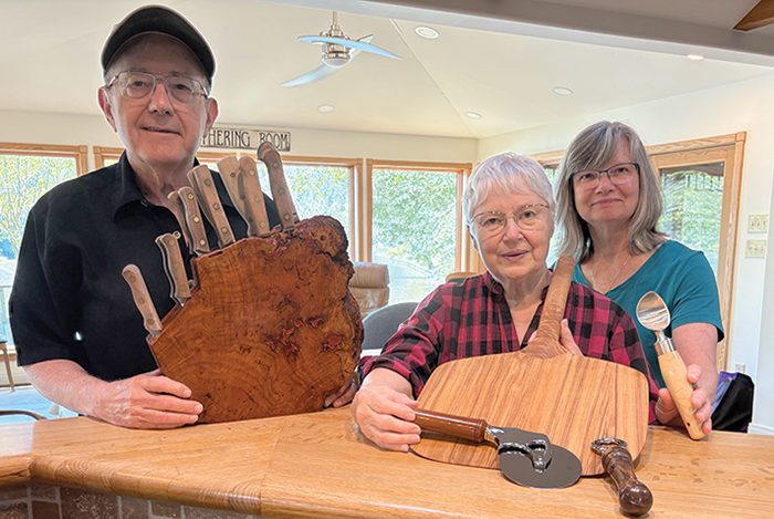 From left, woodworkers Wayne LaGary, Penny Mace and Becky Roberts display the raffle prizes.