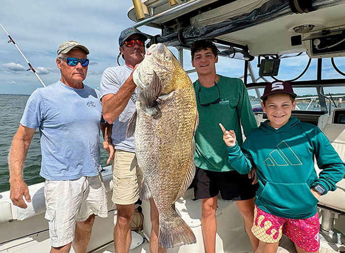 Wade Harrington on August 31 hooked this 60 pound black drum in the Rappahannock River. It took three generations to get it in the boat. Jeff, Charlie and Hank helped pull it in! Photo by Kim Harrington