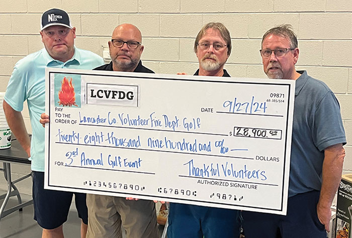 The third annual Lancaster County Volunteer Fire Department Golf Tournament at Golden Eagle Golf Course on Friday, September 27, raised $28,900. From left are Dan Saunders of White Stone Volunteer Fire Department, Roy Hall of Kilmarnock VFD and Danny Akers and Toby Sisson of Upper Lancaster VFD. Some 26 teams participated in the benefit tournament. First flight winners were Hunter Edwards, Steve Pittman, Allen Whitaker and Ben Pittman. Second flight winners were Top Allaun, Cameron Forrester, Rich Ferraro and Ed Pittman.