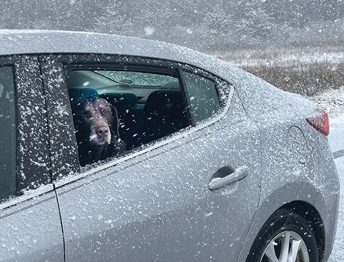 Keely Miller Eubank, catching a few flakes on the nose, yearns to play in the snow while on a wintery wonderland drive to Morrattico Tuesday, February 11. All was not fun and games however, as snow started falling about midmorning and continued into the evening. Travel became treacherous as the day wore on. About 5 p.m., Lancaster issued a traffic alert indicating roads were in severe condition and advising folks to avoid travel to allow the Virginia Department of Transportation to work, while 9-1-1 resources were being stretched thin responding to multiple ongoing incidents. Photo by AnnGardner Eubank