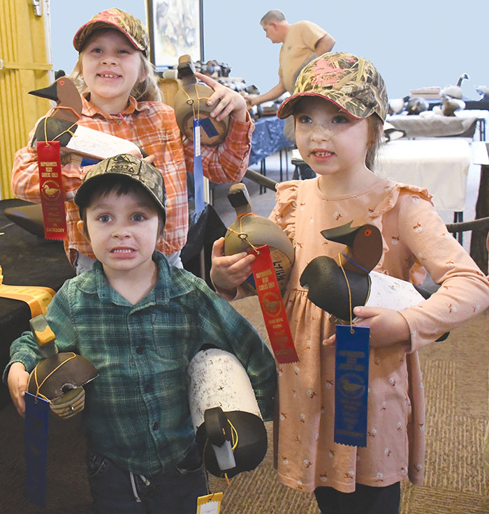From left, siblings Eliza, Emerson and Easton Holicky proudly display decoys and ribbons they won in the youth division of the carving competition sponsored by the Rappahannock Carvers Guild at the Northern Neck Waterfowl and Wildlife Expo March 15 and 16 at the White Stone Firehouse. The youth competition was open to ages 16 and under. The two-day event benefits the White Stone Volunteer Fire Department and drew some 1,300 people, according to committee member CD Hathaway. See more photos in the Record print and electronic editions this week. Photo by Lisa Hinton-Valdrighi